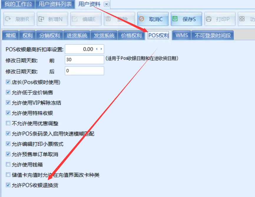 回答: 此问题是用户权限的退换货功能被关闭了。开启即可 用户资料----选中用户---POS权利---勾选“允许POS收银退换货”